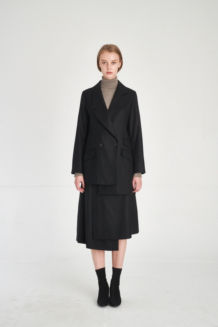 (FREAKSBYKIMTAEHOON) Modern Structural Asymmetric Wrap Design Wool 100% Midi-Skirt_JET BLACK