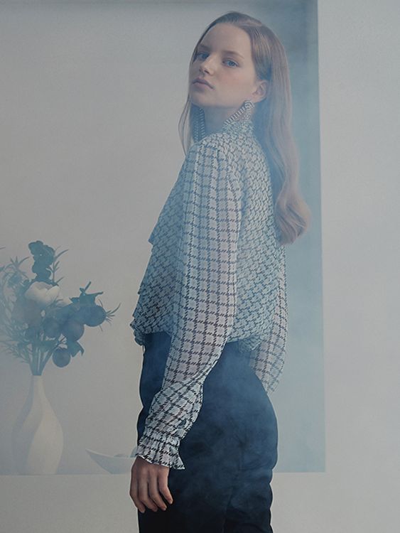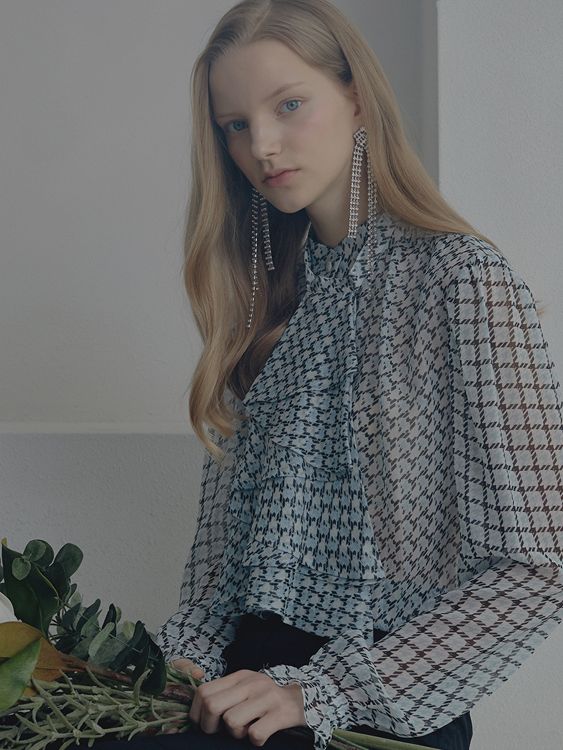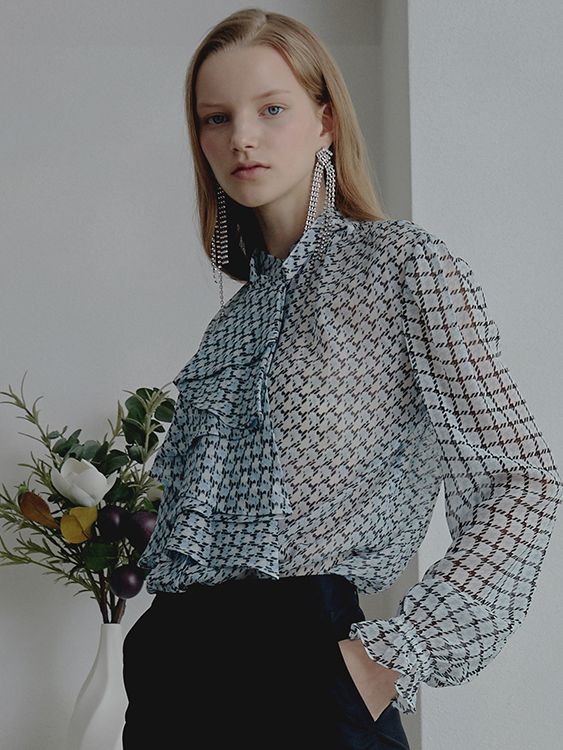 (iCE GARDEN) HOUNDSTOOTH PRINT CRAVAT BLOUSE_AIR BLUE