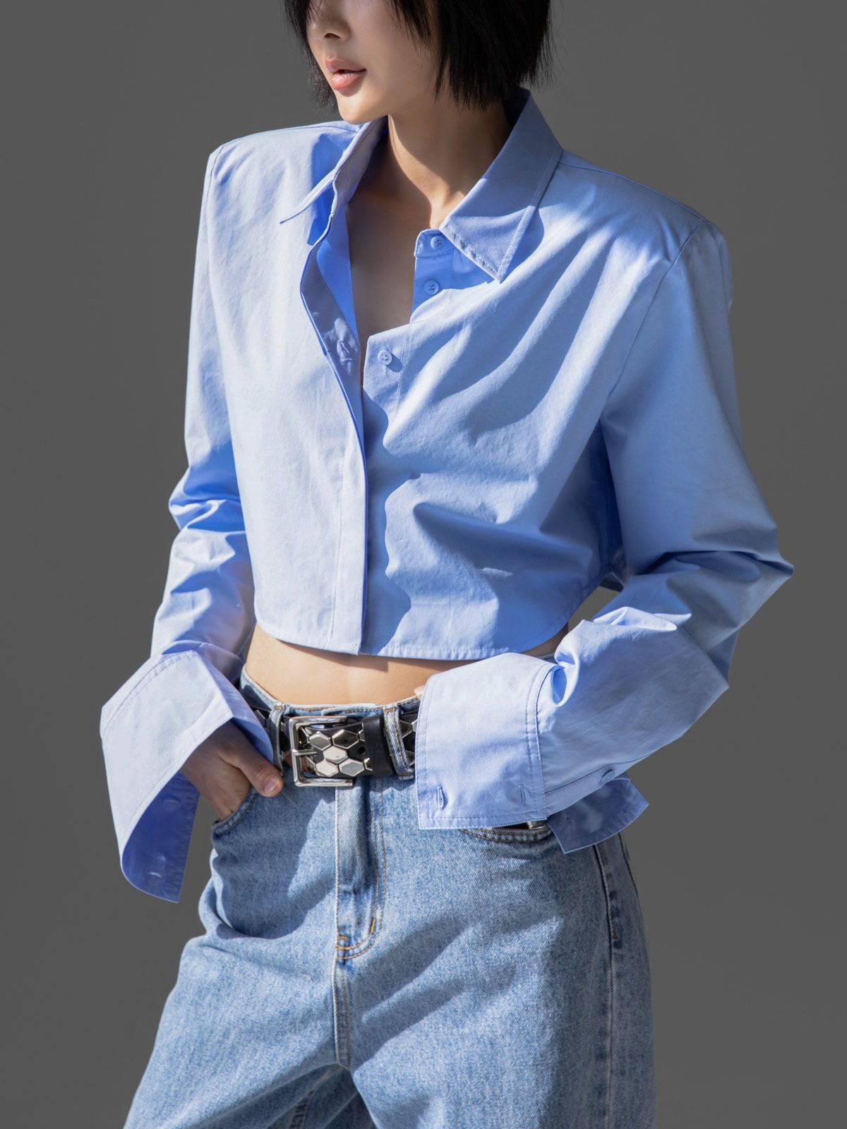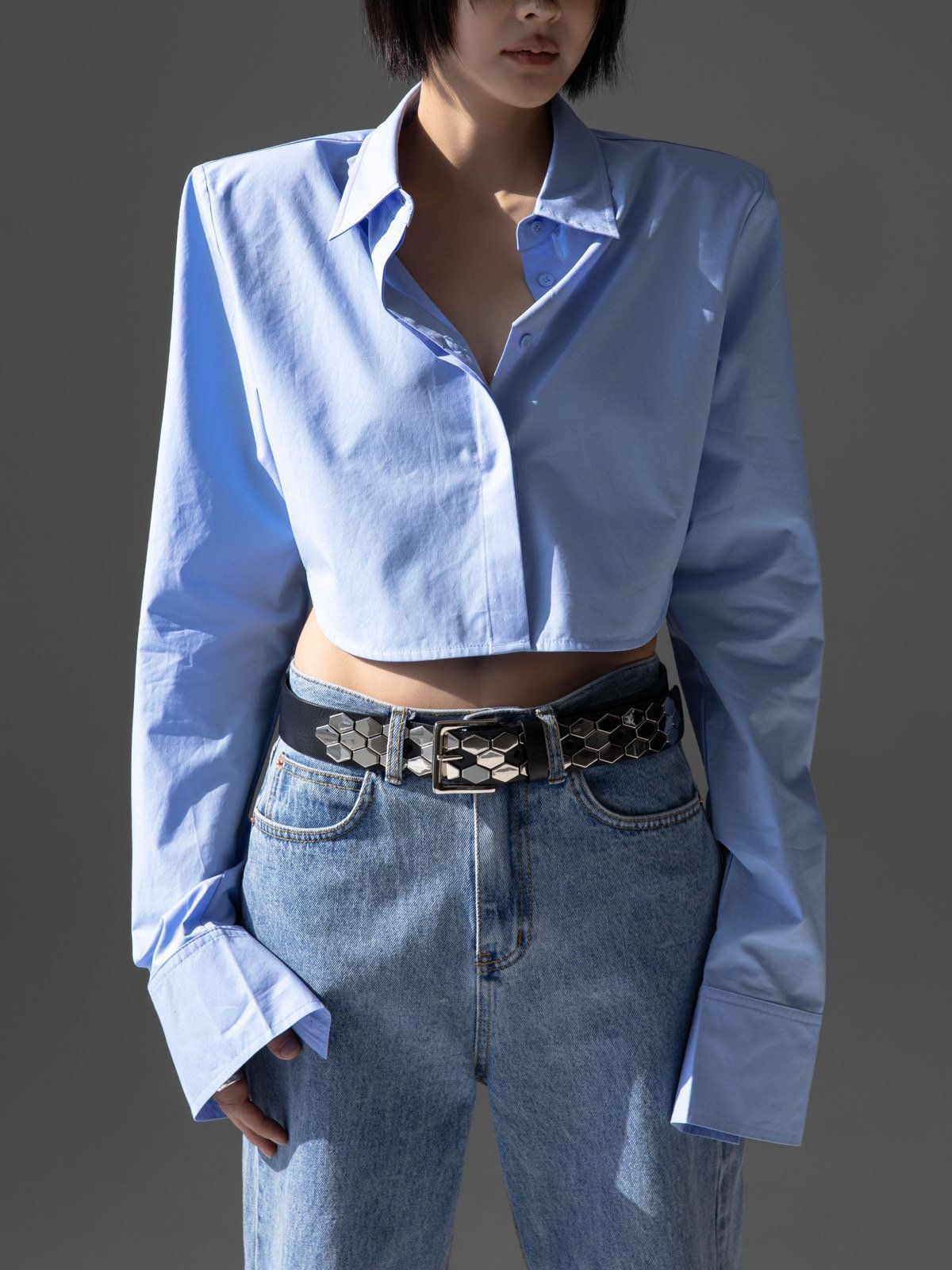 (PAPER MOON) CLASSIC SHOULDER PAD CROPPED BUTTON DOWN SHIRT : BLUE