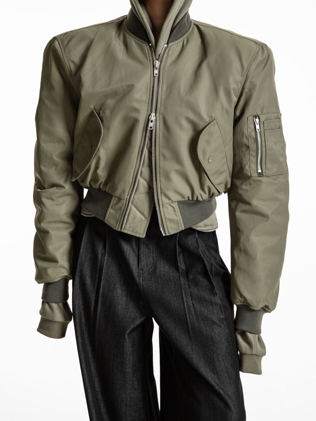 (PAPER MOON) SQUARE SHOULDER PADDED CROPPED BOMBER JACKET : KHAKI