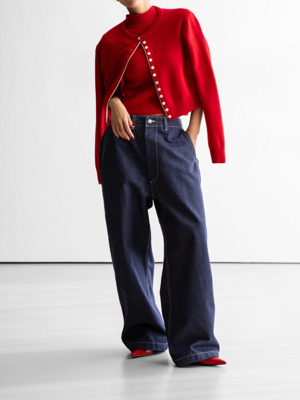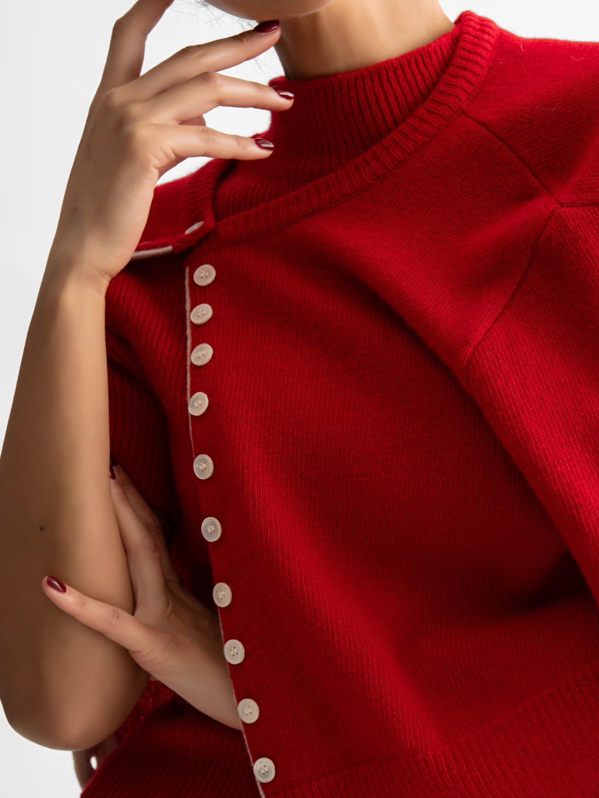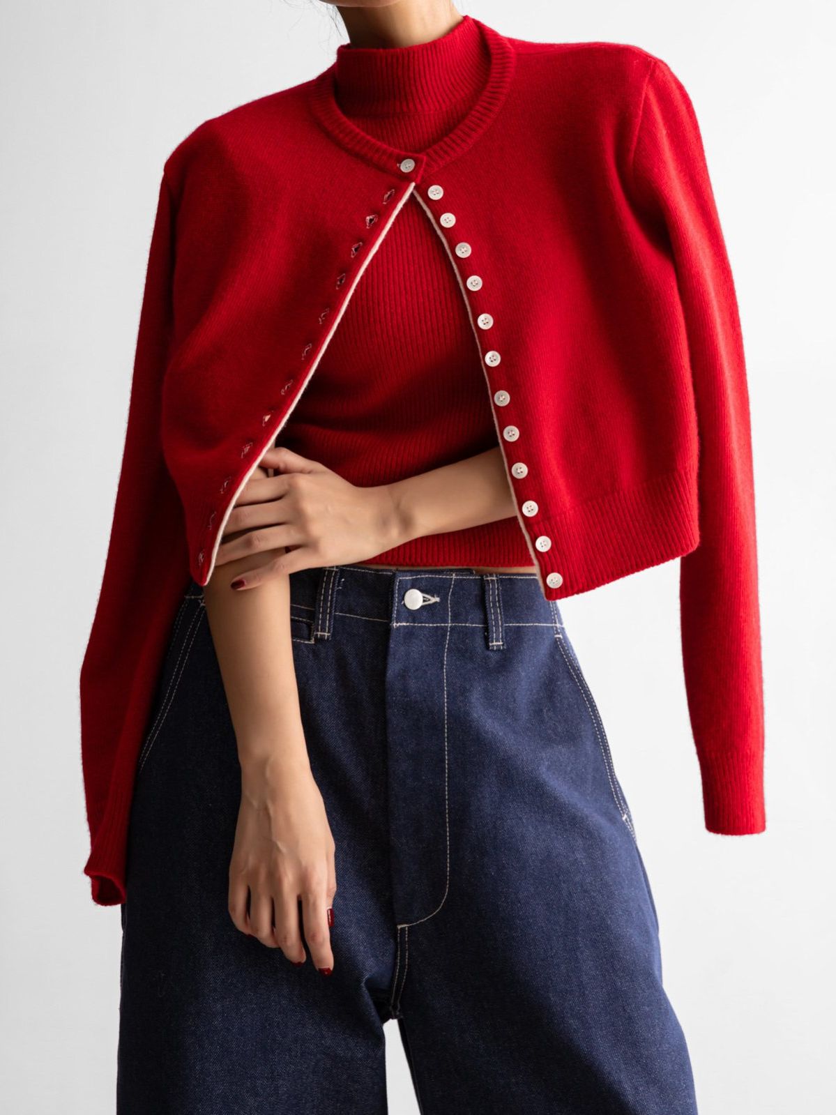 (PAPER MOON) COLOR BI - STITCHED BUTTON DETAIL CASHMERE WOOL CROPPED CARDIGAN : RED