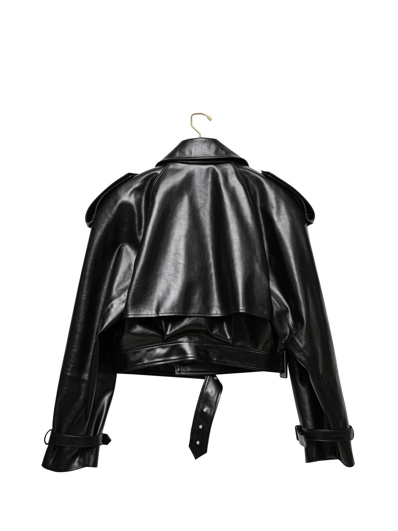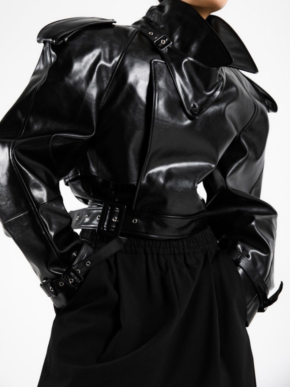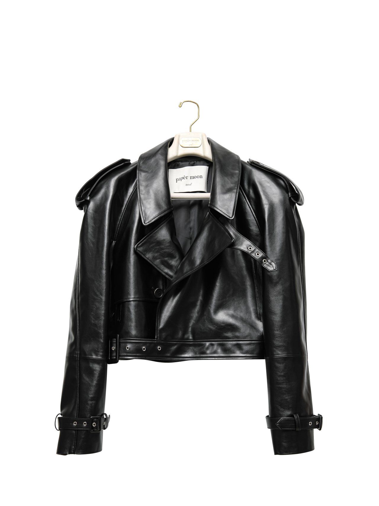 (PAPER MOON) BELTED BUCKLE DETAIL CHUNKY CROPPED LEATHER TRENCH JACKET : BLACK