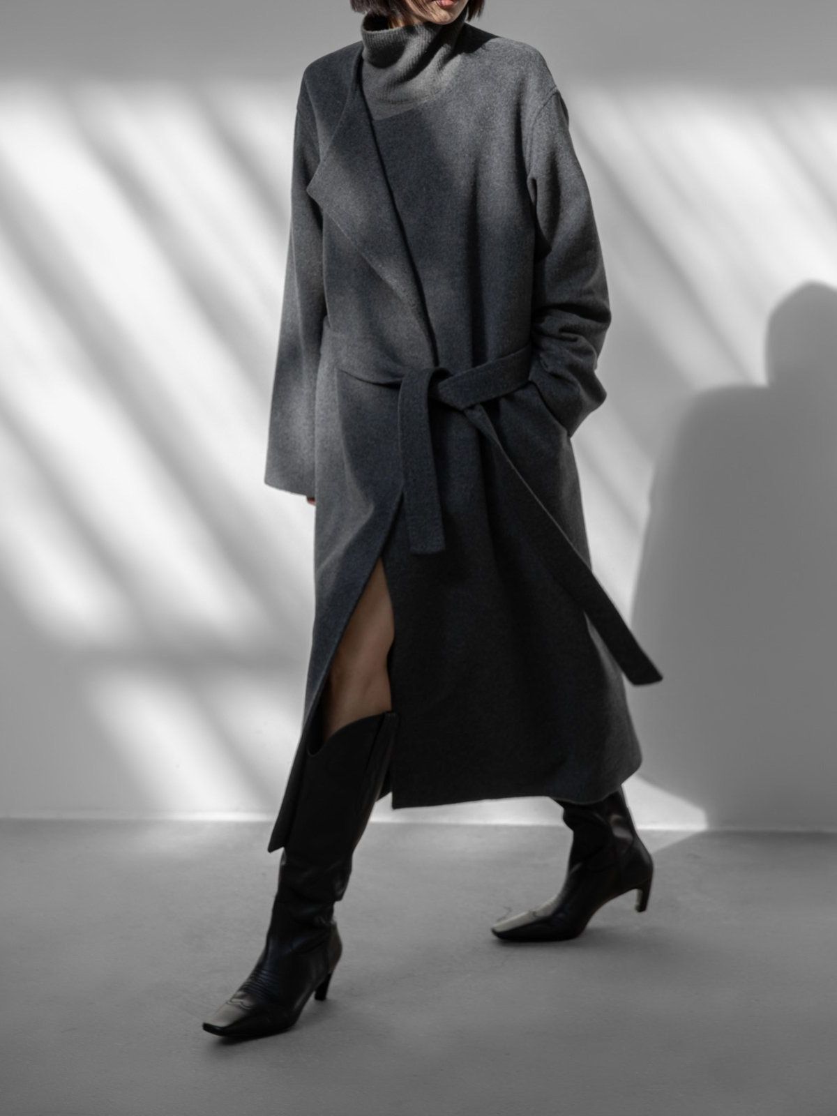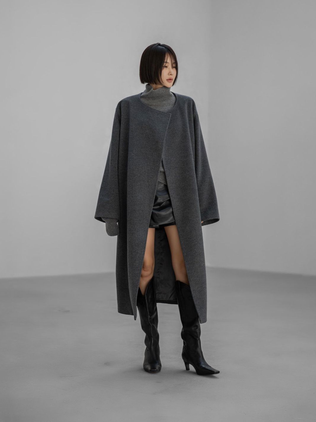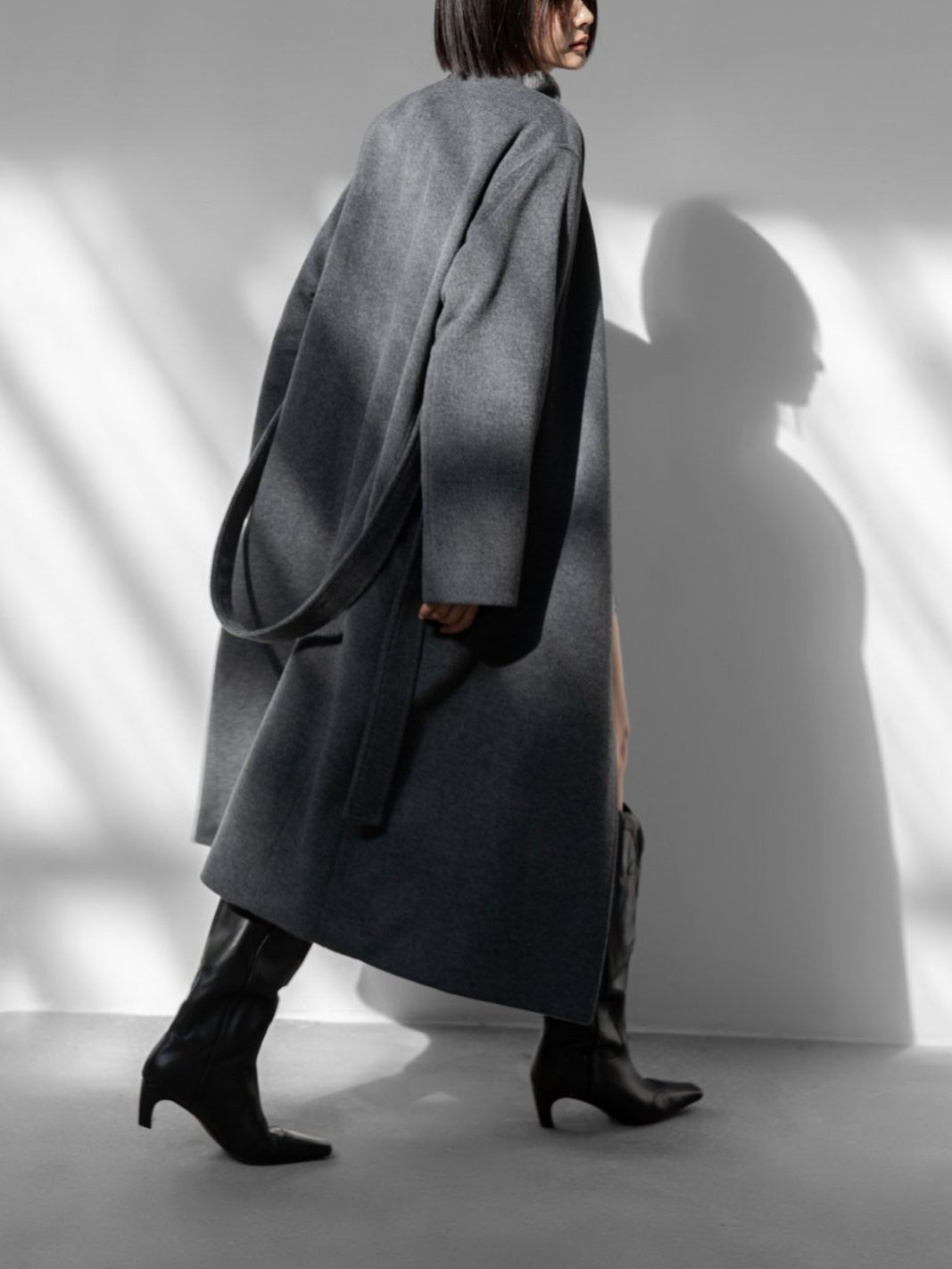 (PAPER MOON) LUX CASHMERE WOOL STITCHED POINT ROBE BELTED COAT : HEATHER GREY