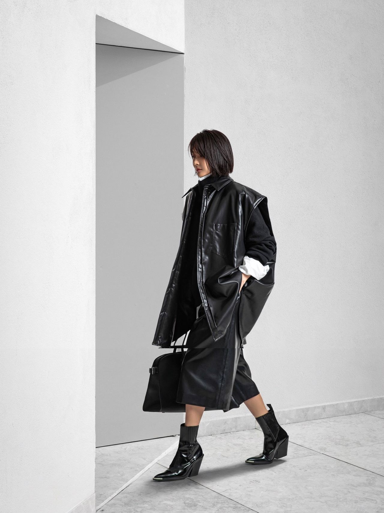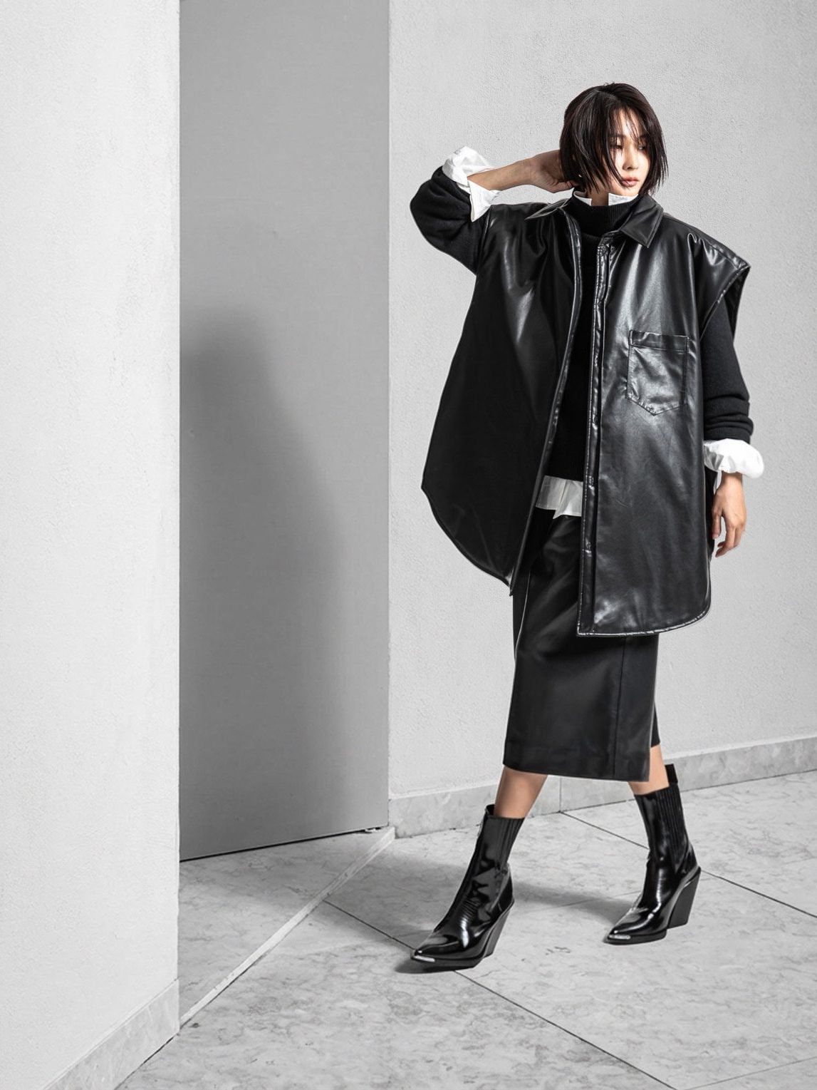 (PAPER MOON) OVERSIZED PADDED VEGAN LEATHER SLEEVELESS VEST SHIRT : BLACK