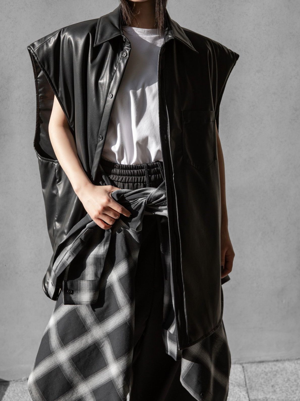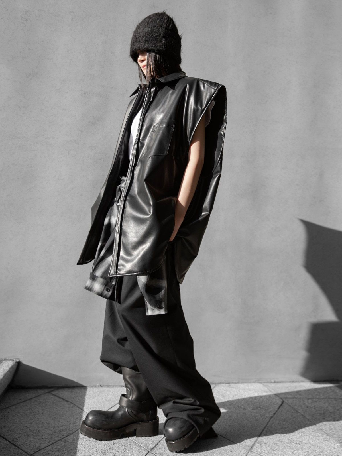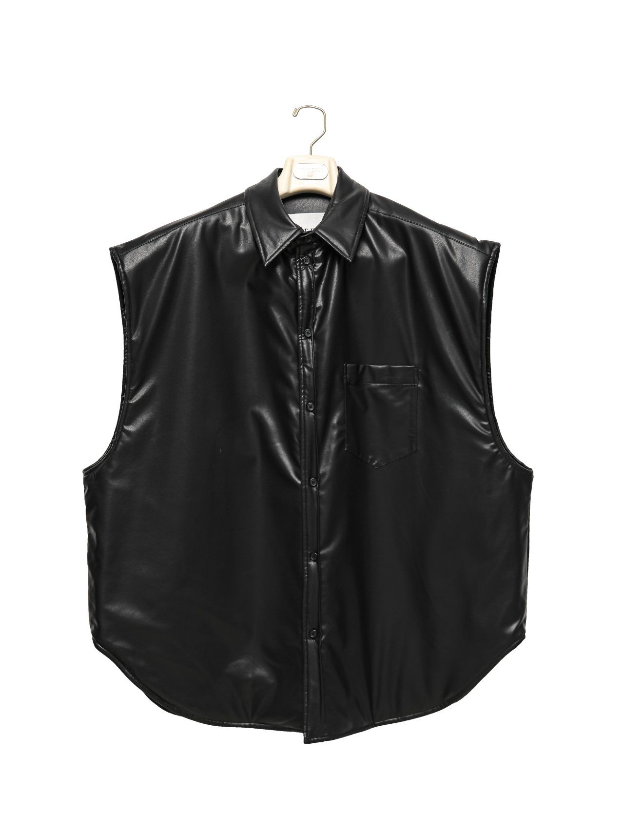 (PAPER MOON) OVERSIZED PADDED VEGAN LEATHER SLEEVELESS VEST SHIRT : BLACK