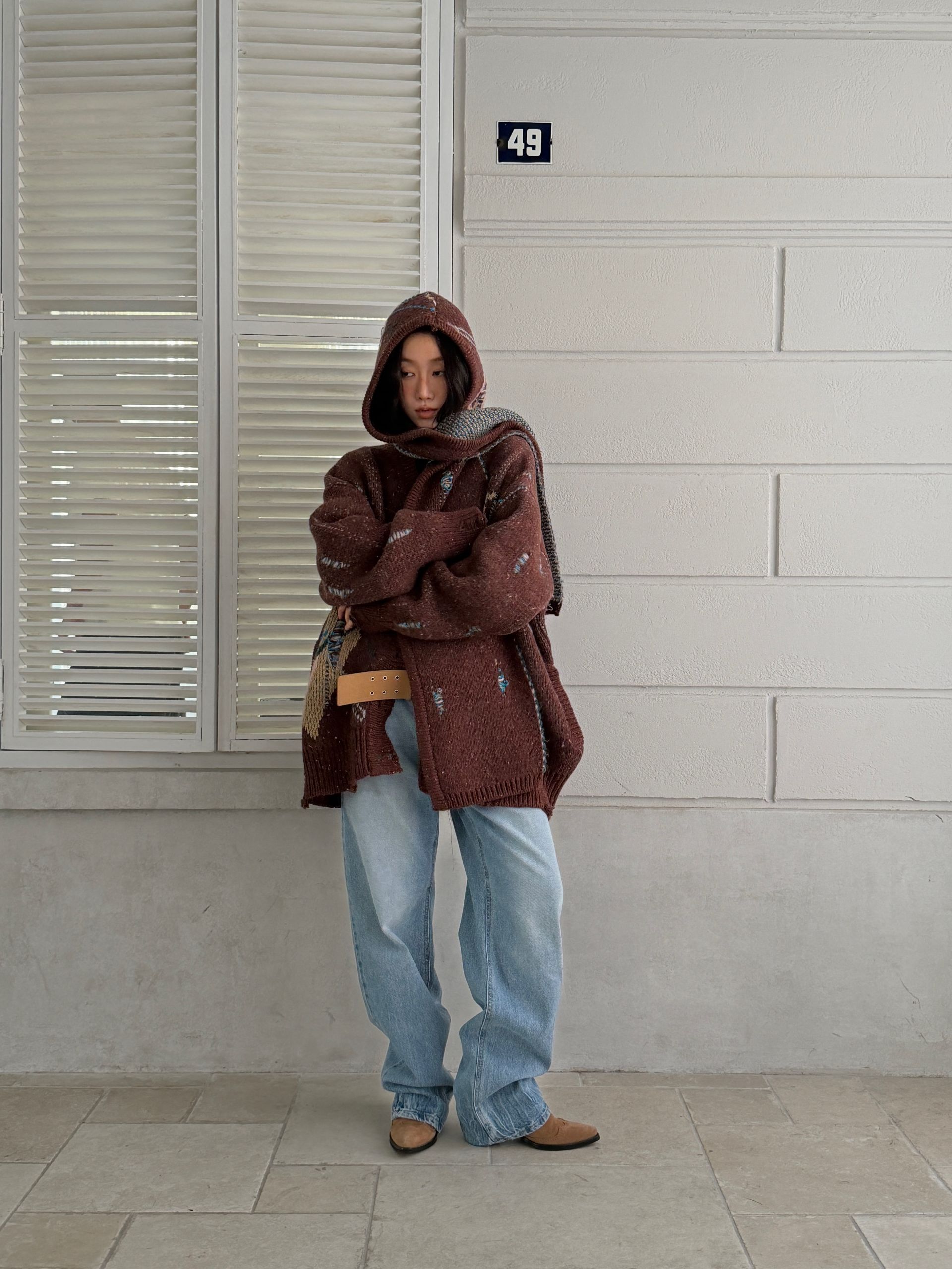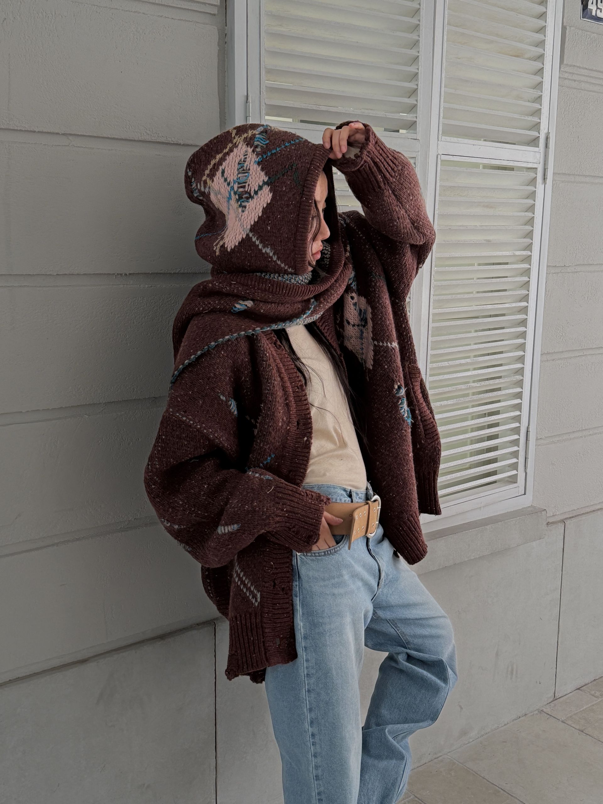 (TOM GIRL) AGAIL HOOD MUFFLER & CARDIGAN : BROWN