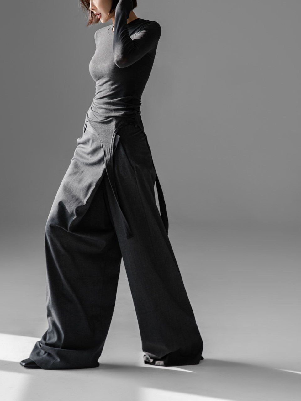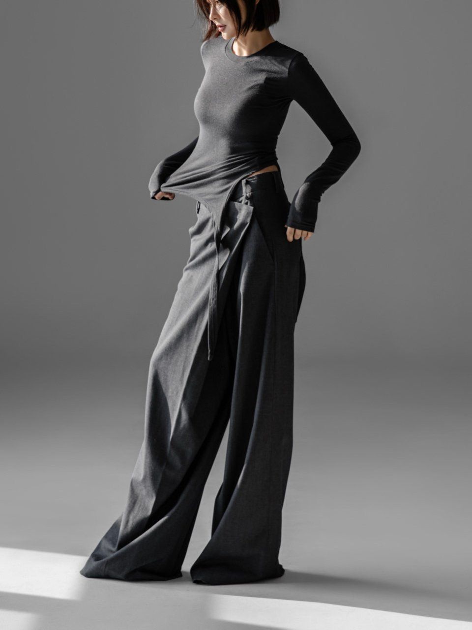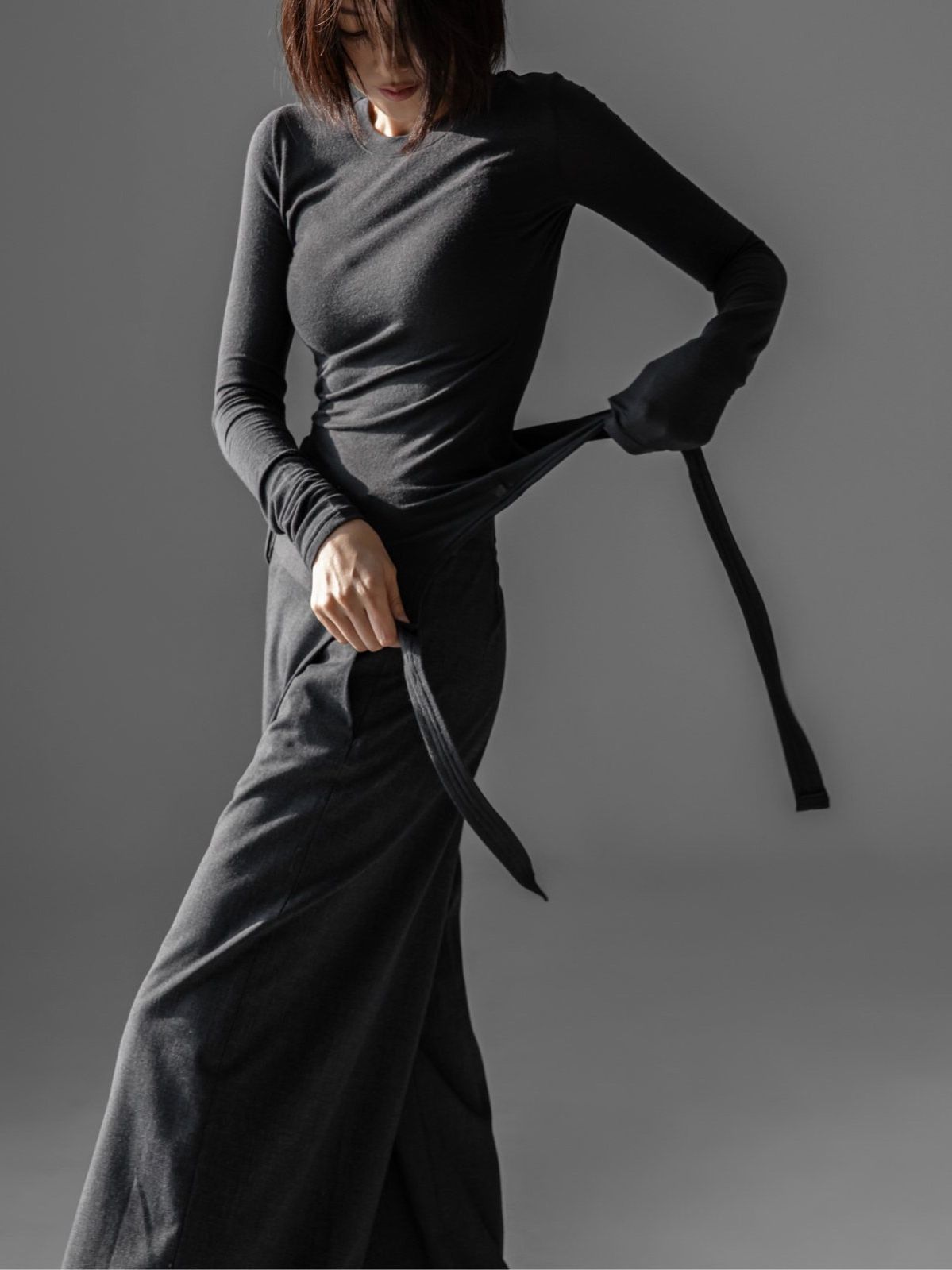 (PAPER MOON) UNBALANCED HEM LINE DETAIL SLIM LONG SLEEVED TEE : BLACK