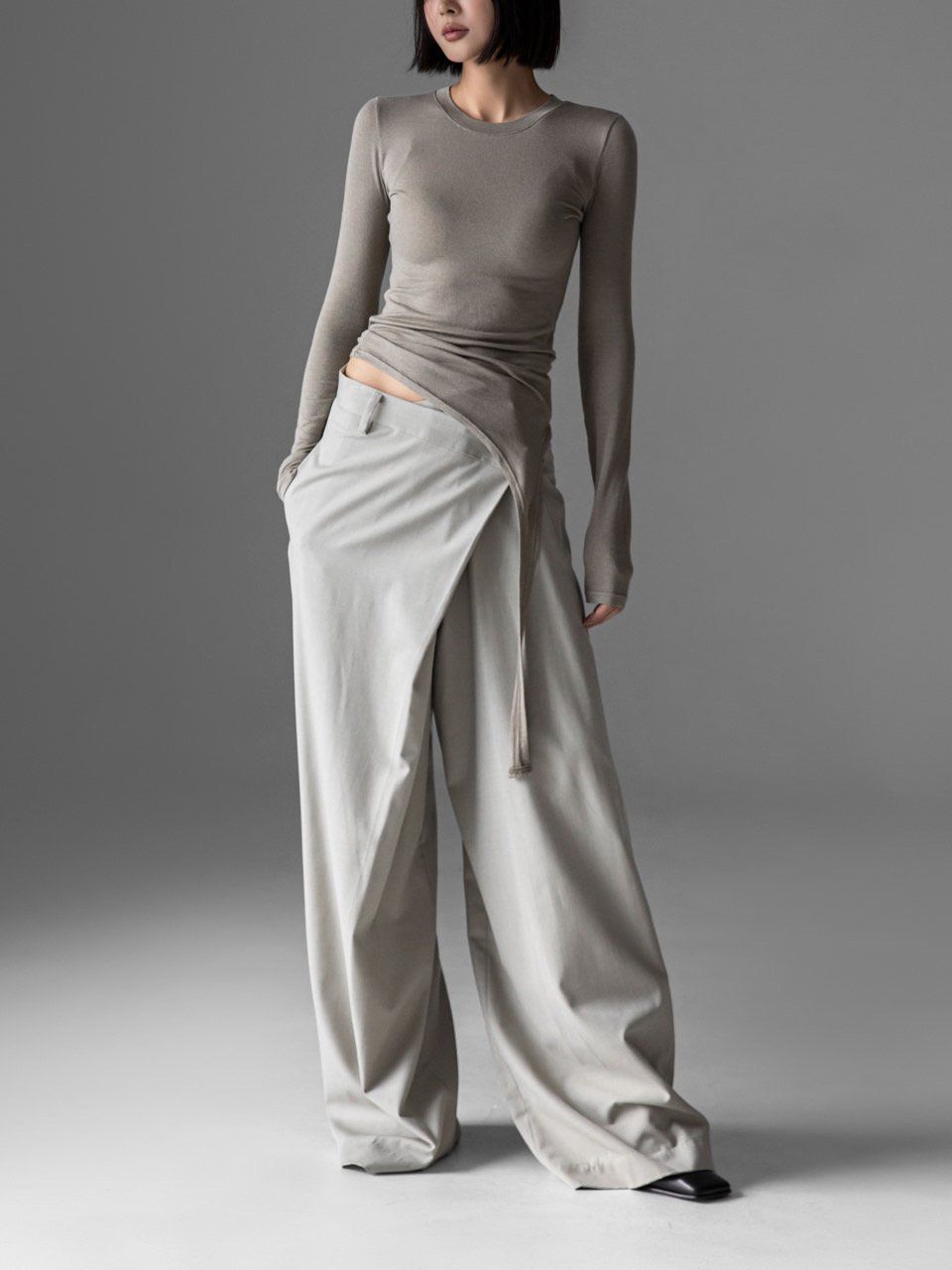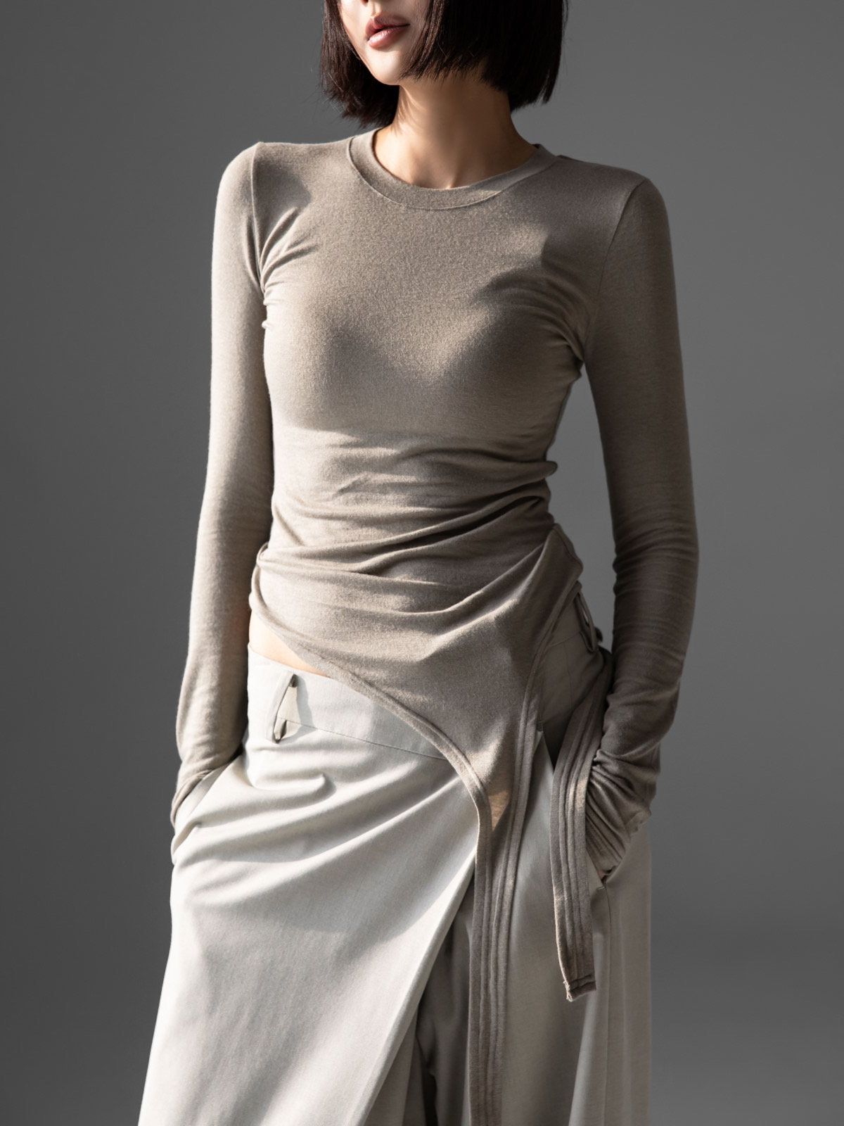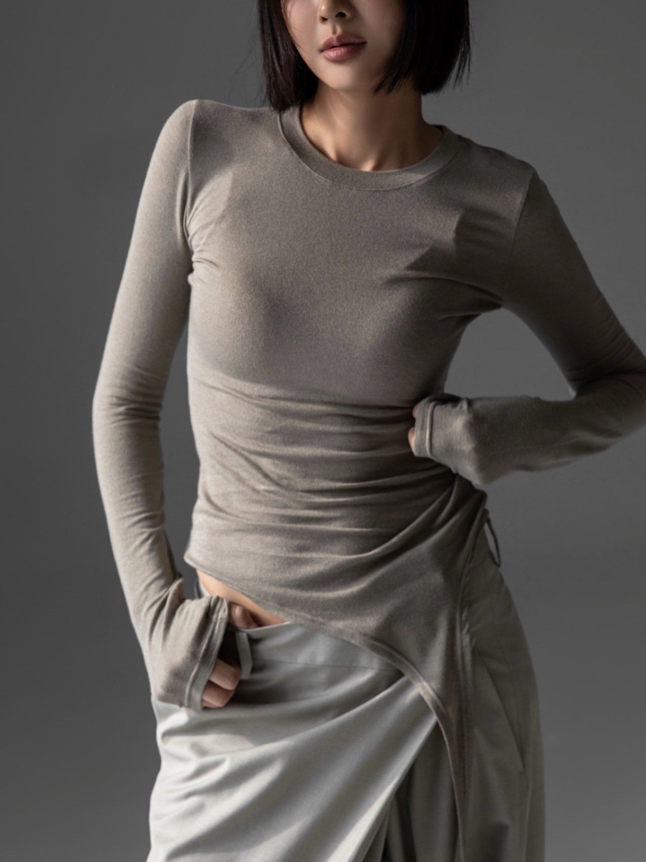 (PAPER MOON) UNBALANCED HEM LINE DETAIL SLIM LONG SLEEVED TEE : HEATHER GREY