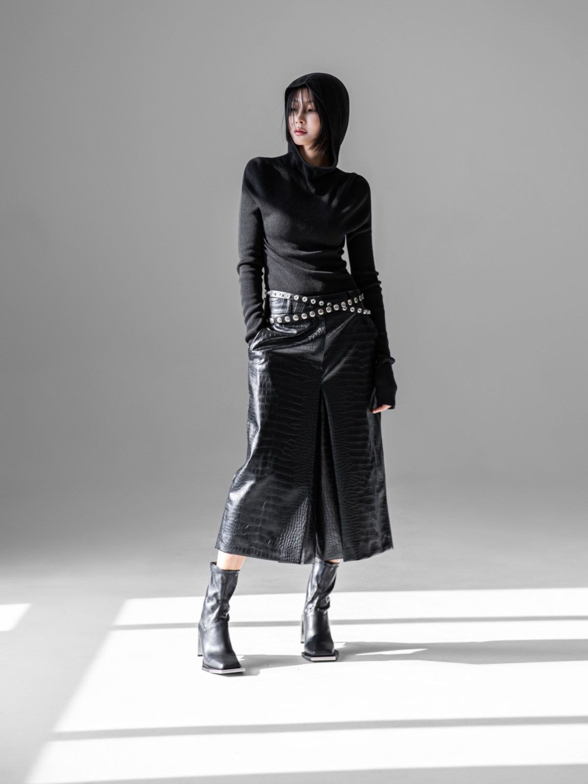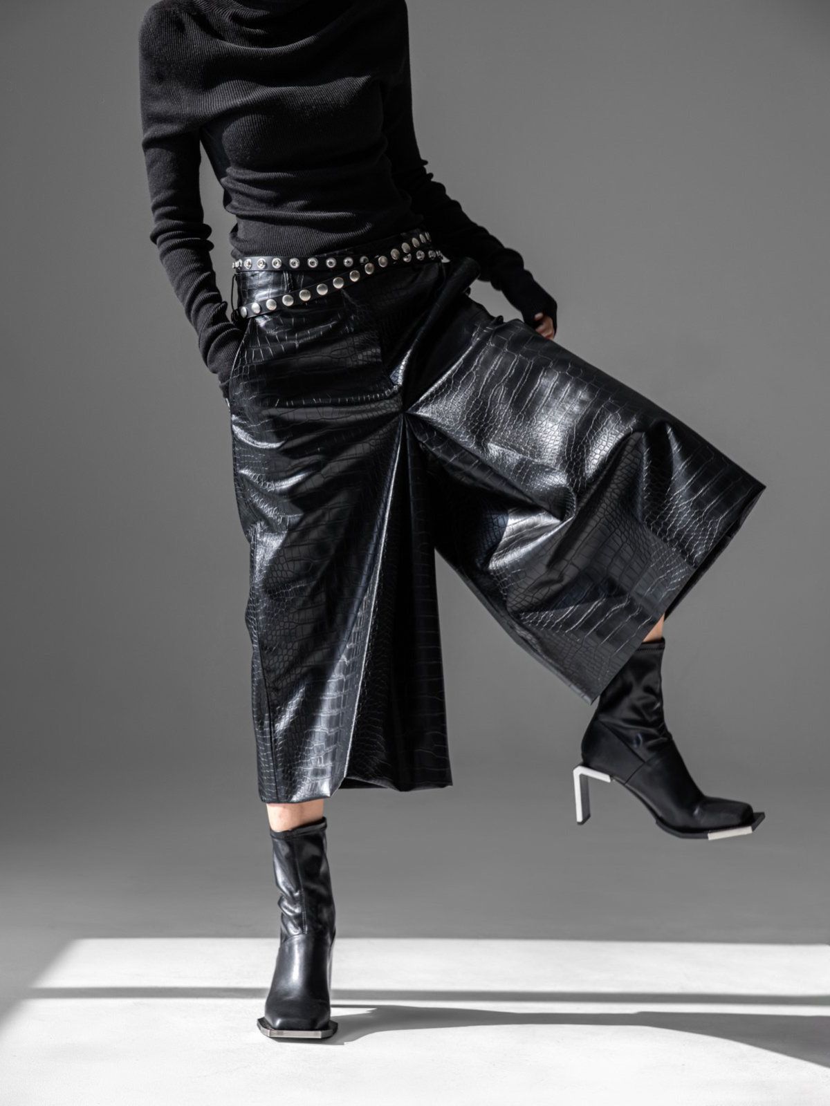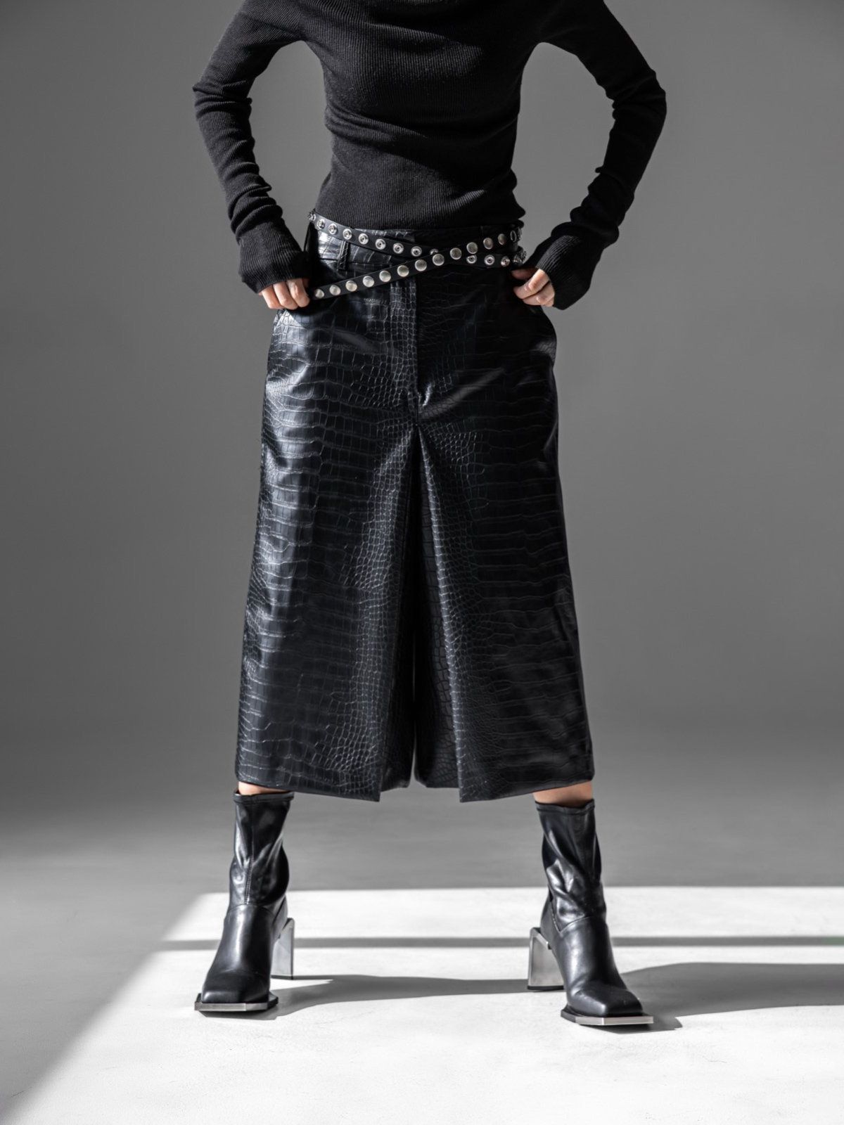 (PAPER MOON) CROCODILE VEGAN LEATHER SKIRT DETAIL WIDE CULOTTES PANTS : BLACK