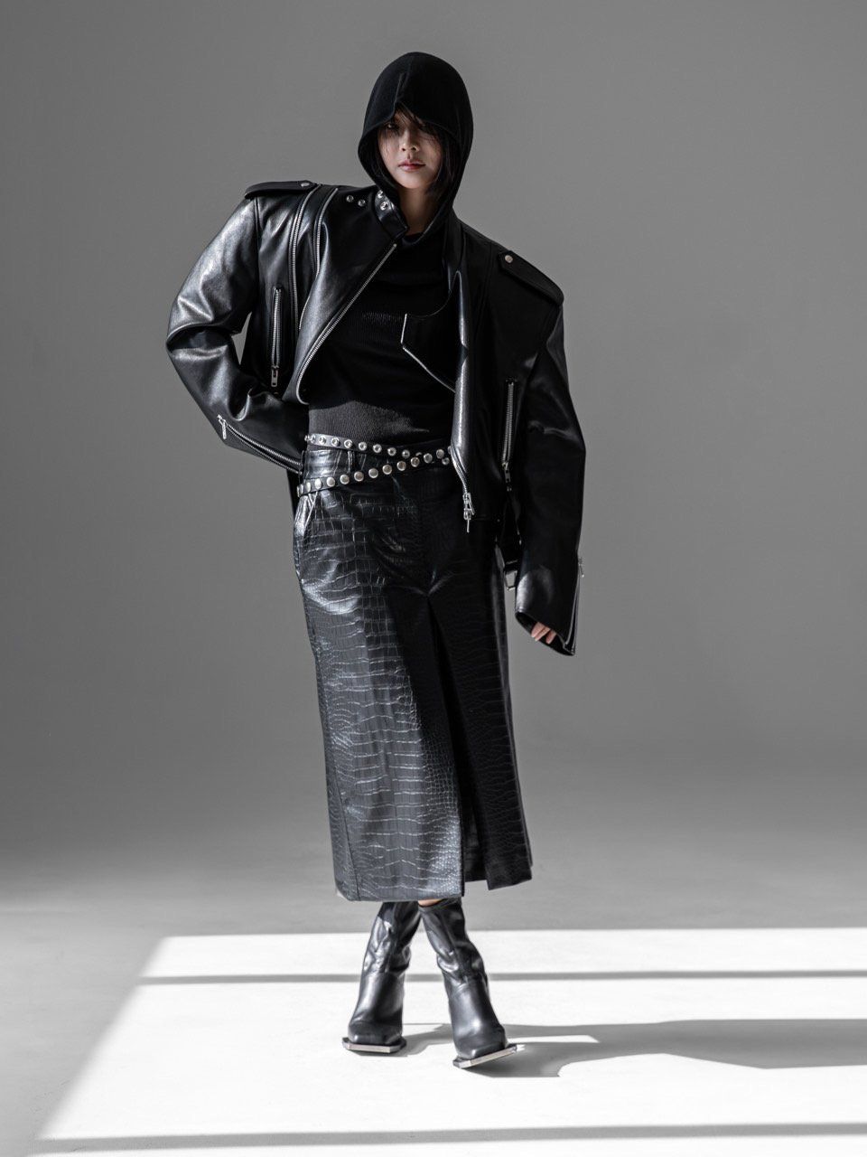 (PAPER MOON) DOUBLE ZIPPED DETAIL VEGAN LEATHER BUCKLE BELTED BIKER JACKET : BLACK