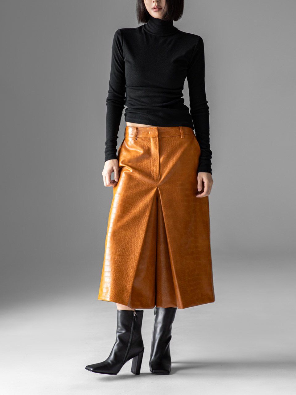 (PAPER MOON) CROCODILE VEGAN LEATHER SKIRT DETAIL WIDE CULOTTES PANTS : ORANGE BROWN