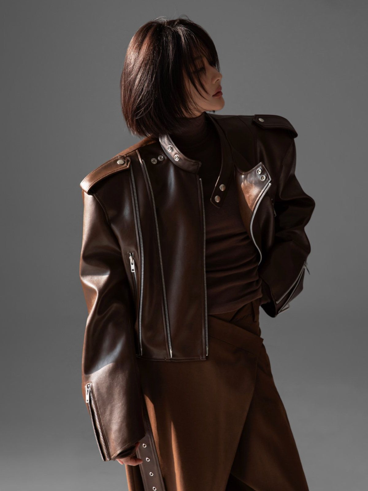 (PAPER MOON) DOUBLE ZIPPED DETAIL VEGAN LEATHER BUCKLE BELTED BIKER JACKET : BROWN