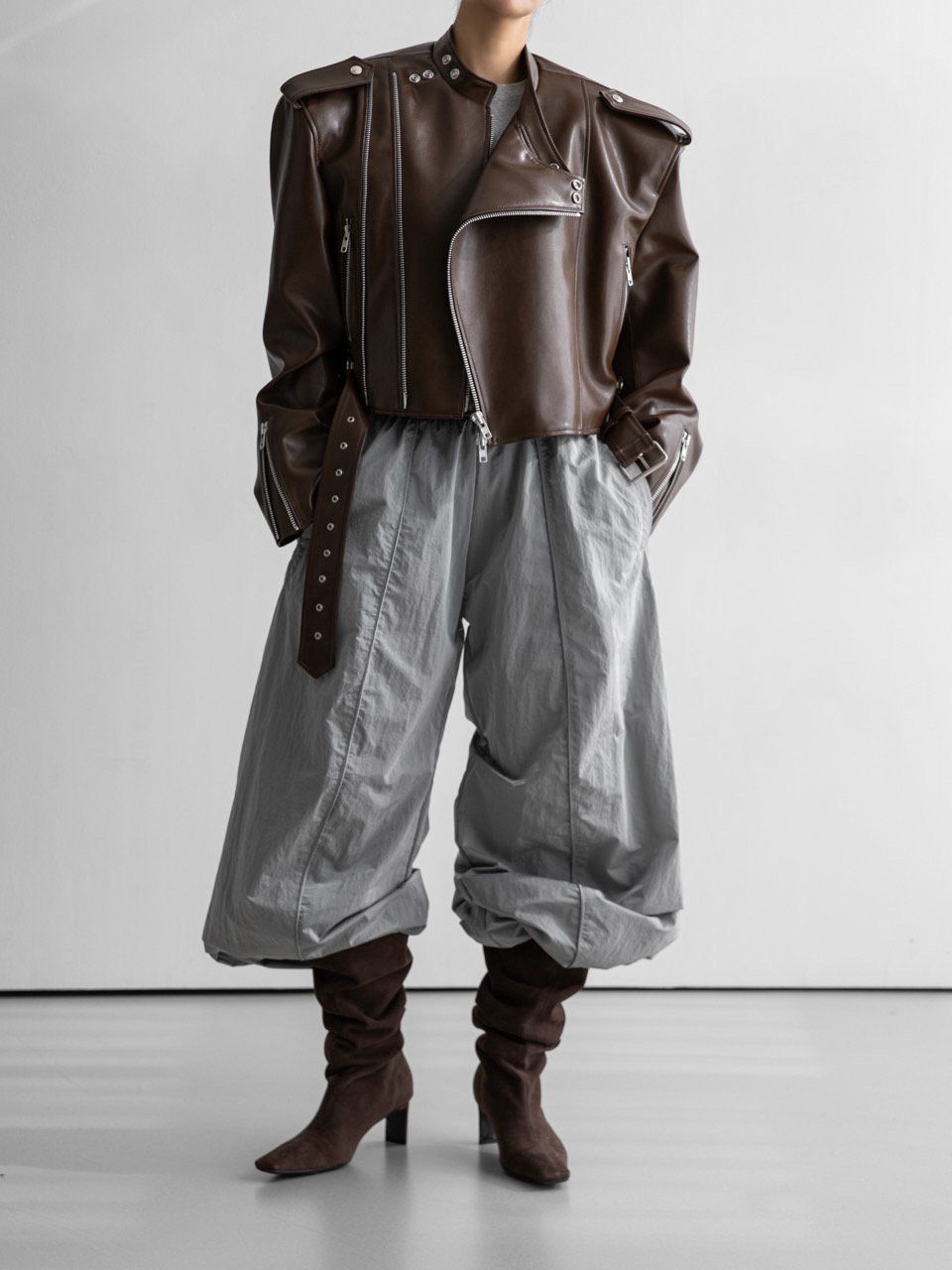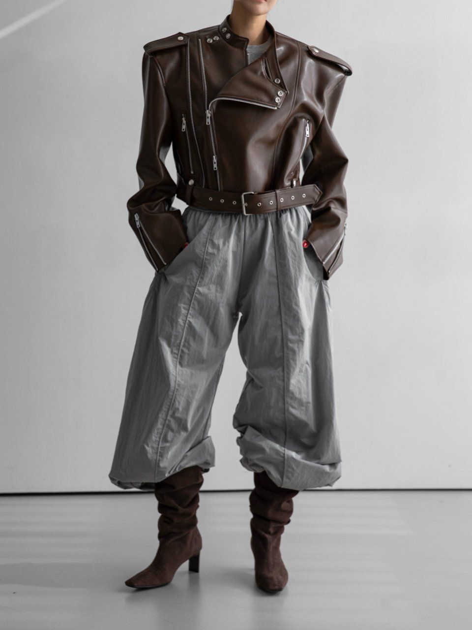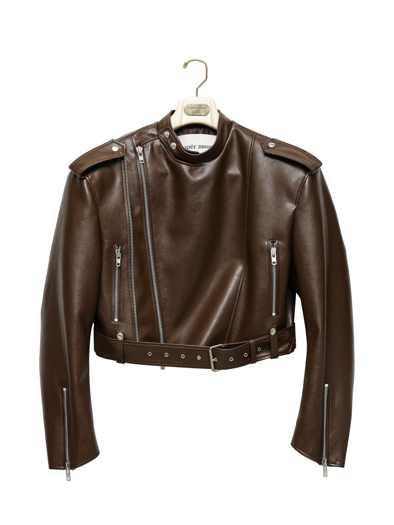 (PAPER MOON) DOUBLE ZIPPED DETAIL VEGAN LEATHER BUCKLE BELTED BIKER JACKET : BROWN