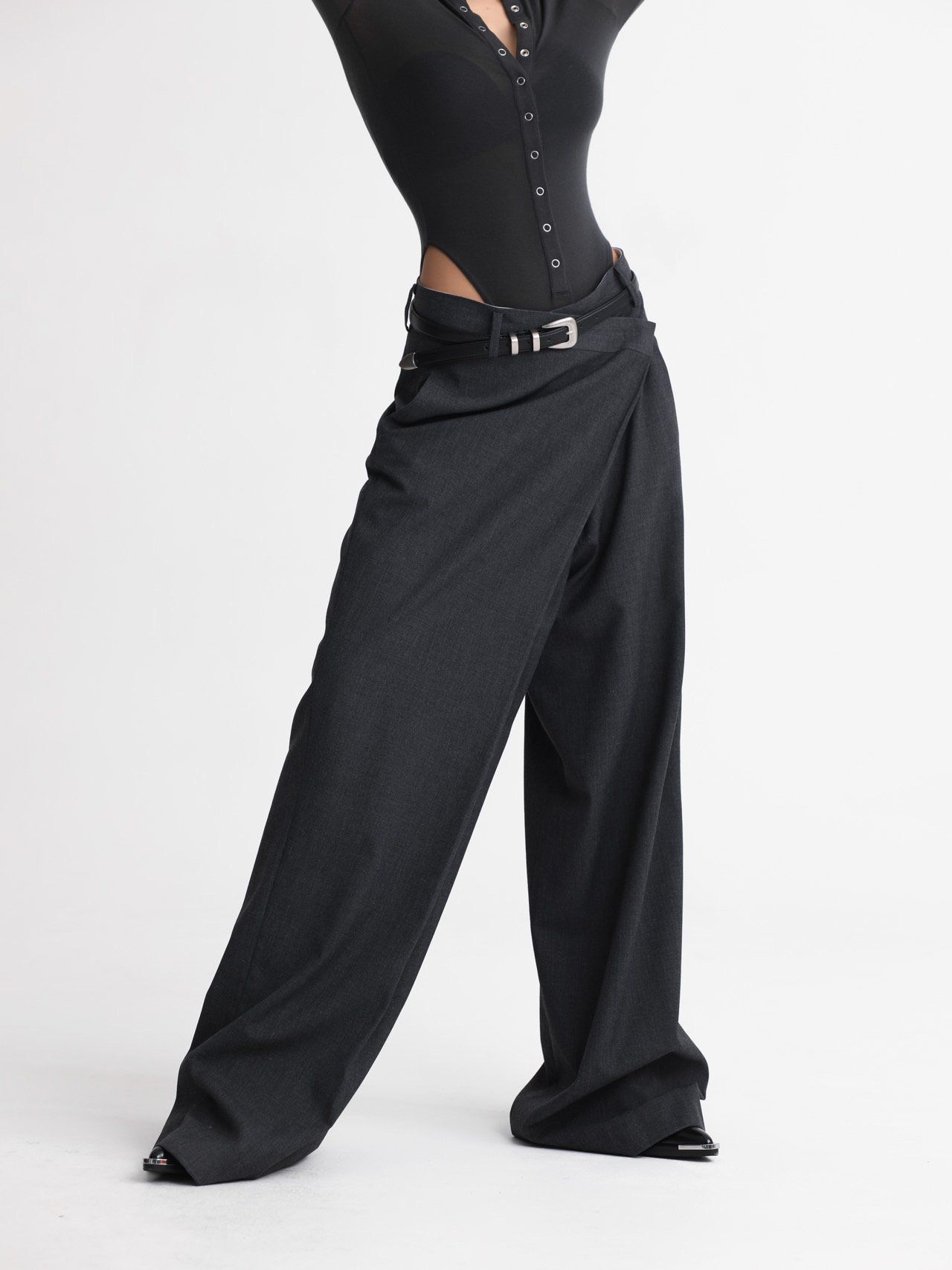 (PAPER MOON) ASYMMETRY PIN TUCK WIDE MAXI TROUSERS : CHARCOAL