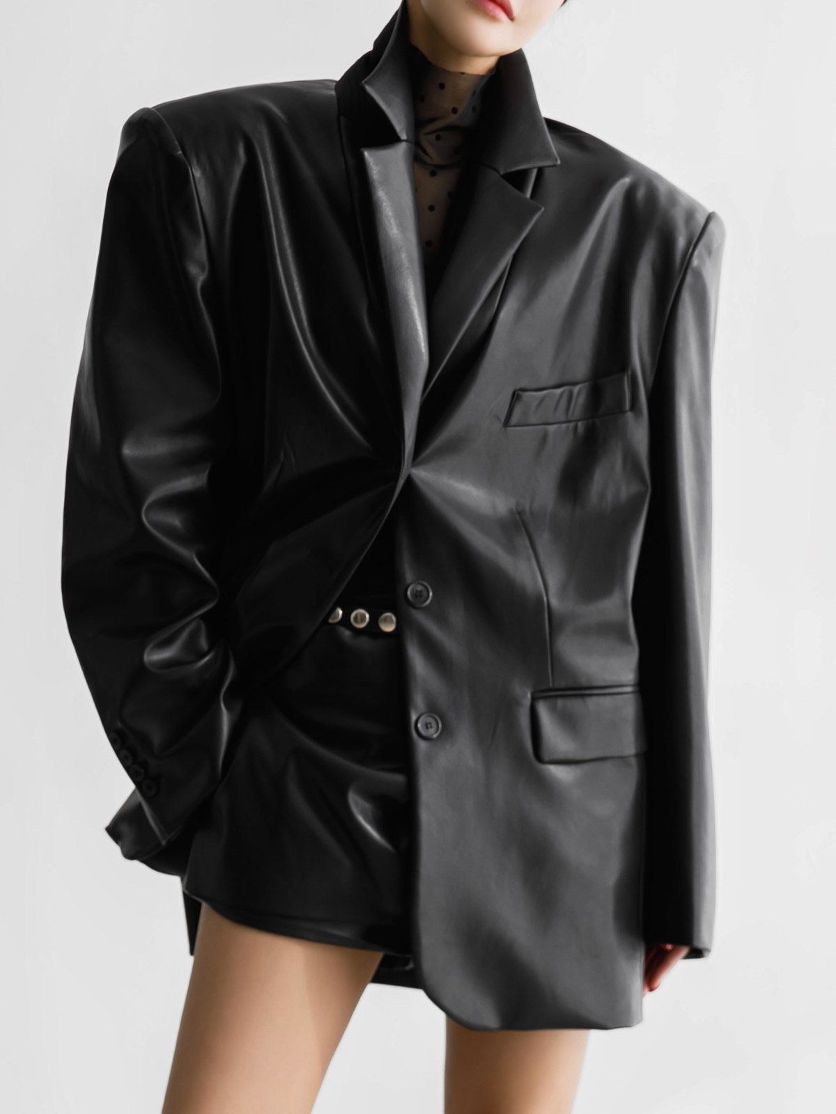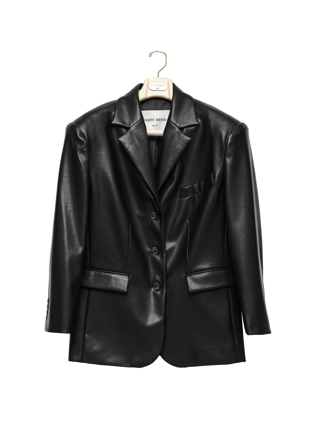 (PAPER MOON) OVERSIZED SHINY LEATHER THREE BUTTON BLAZER : BLACK