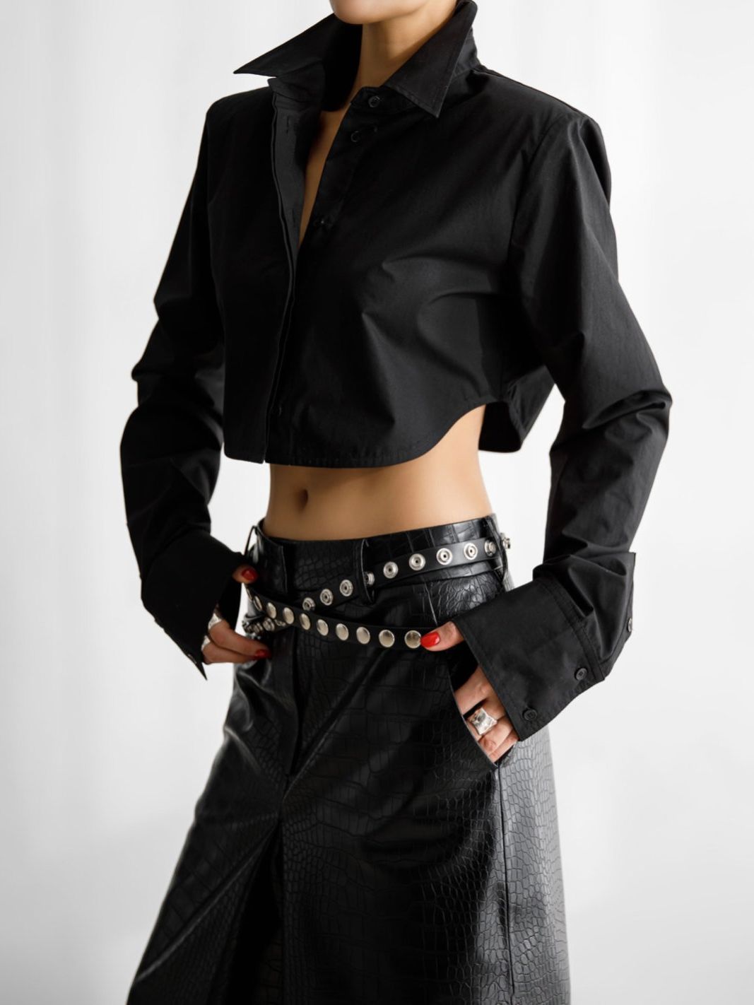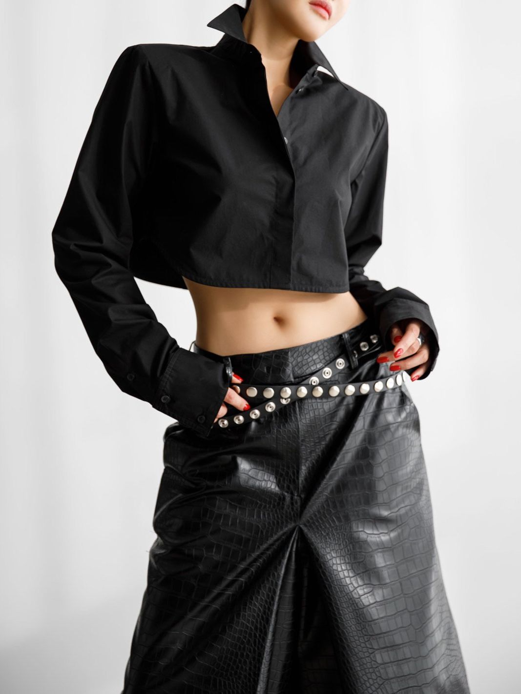 (PAPER MOON) CLASSIC SHOULDER PAD CROPPED BUTTON DOWN SHIRT : BLACK
