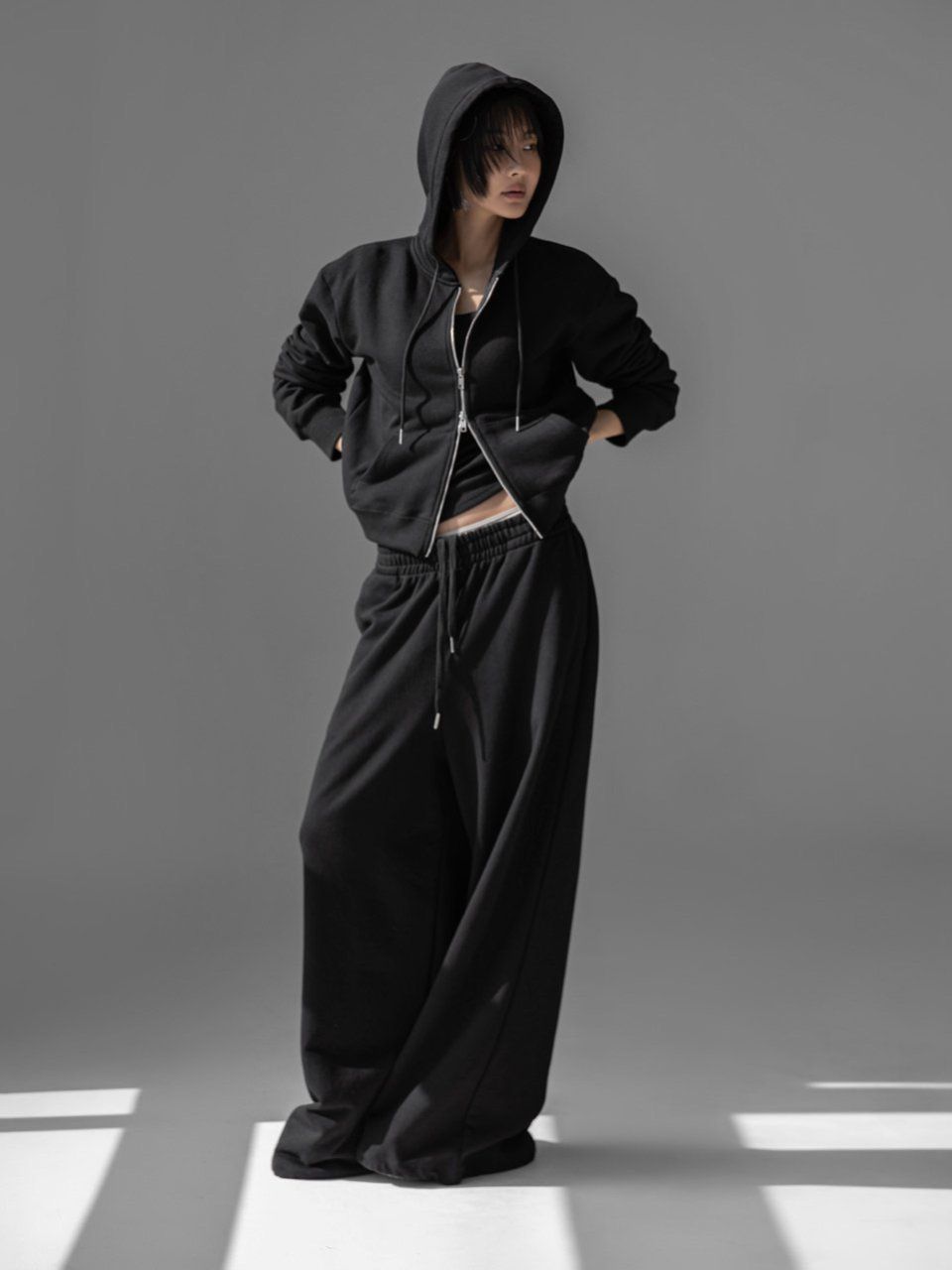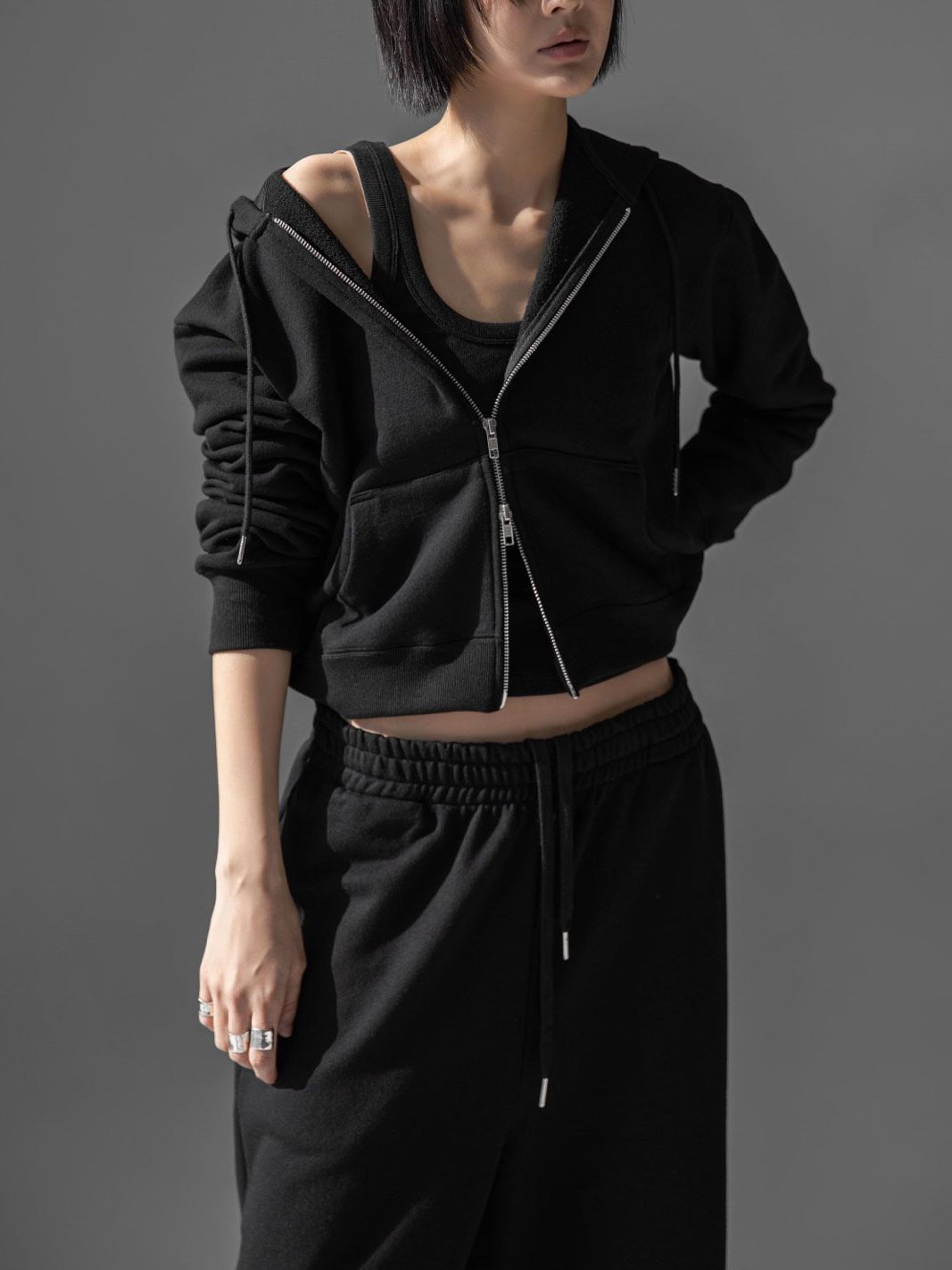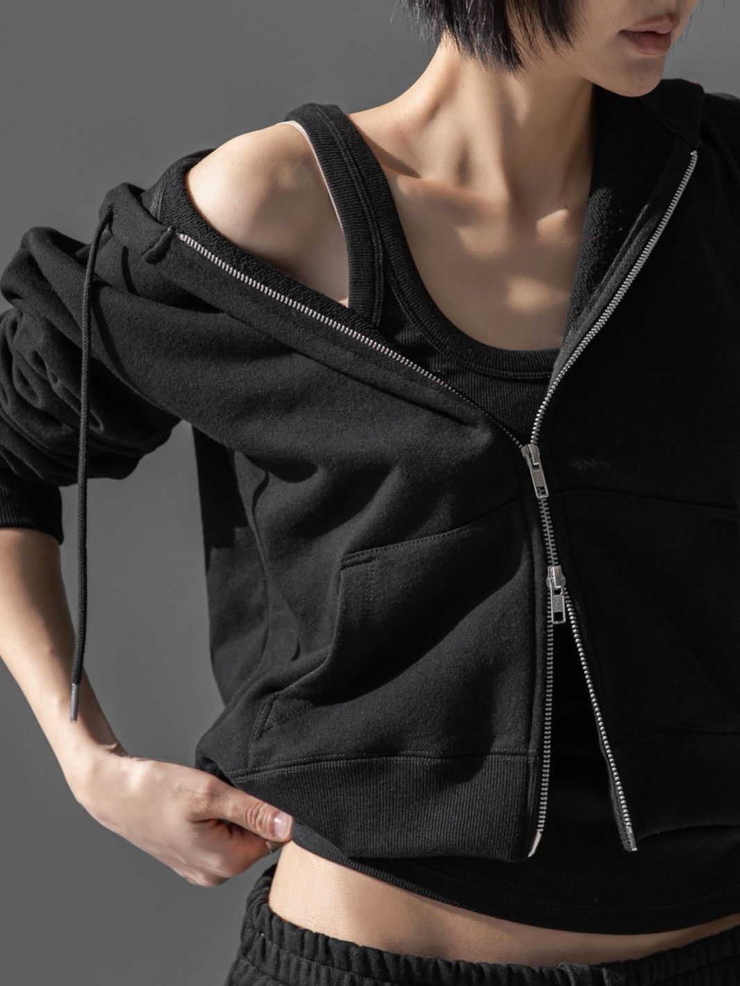 (PAPER MOON) CLASSIC SLIM FIT TWO WAY ZIPPED UP HOODIE : BLACK