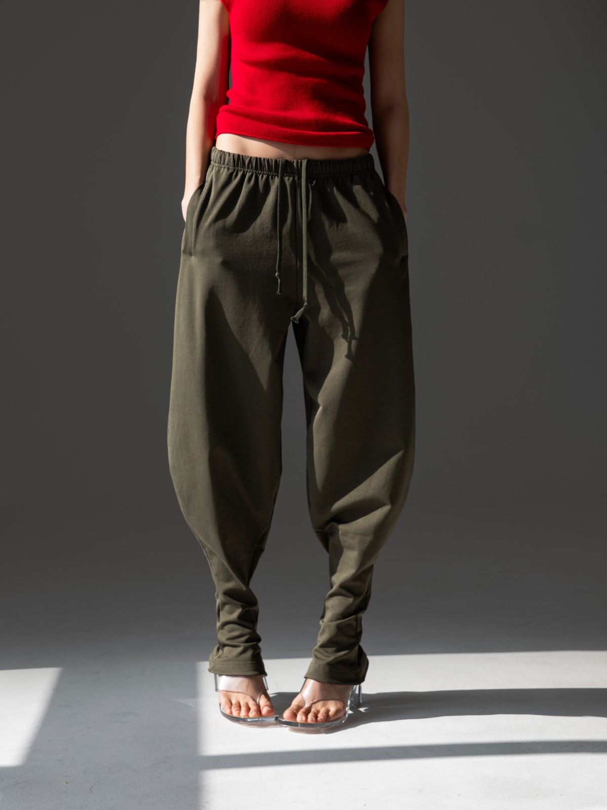 (PAPER MOON) CURVED BALLOON LEG JERSEY PANTS : KHAKI