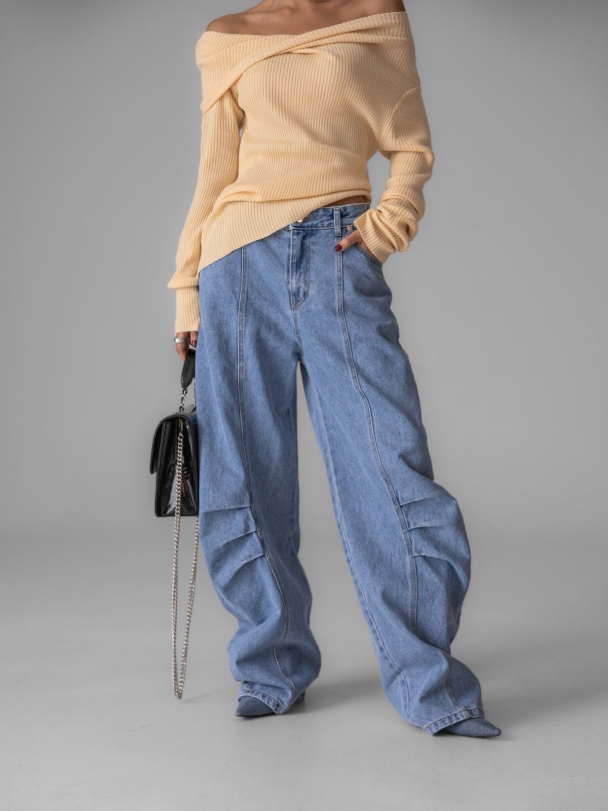 (PAPER MOON) VOLUME PINTUCK DENIM PANTS : WASHED MID BLUE